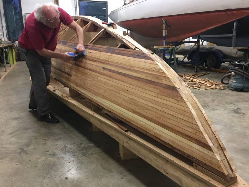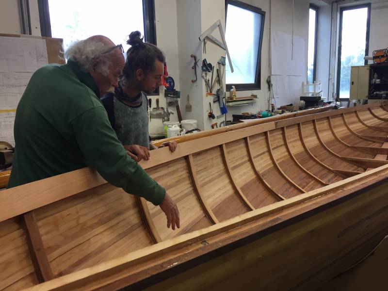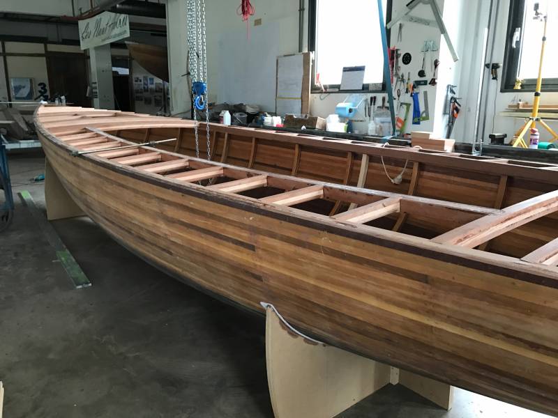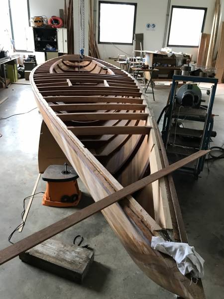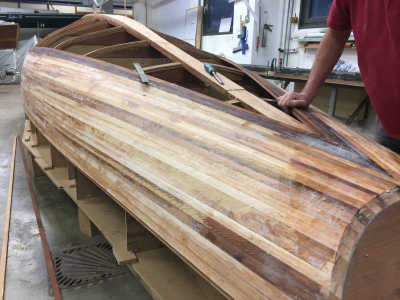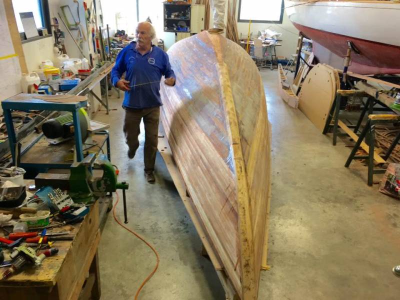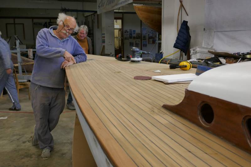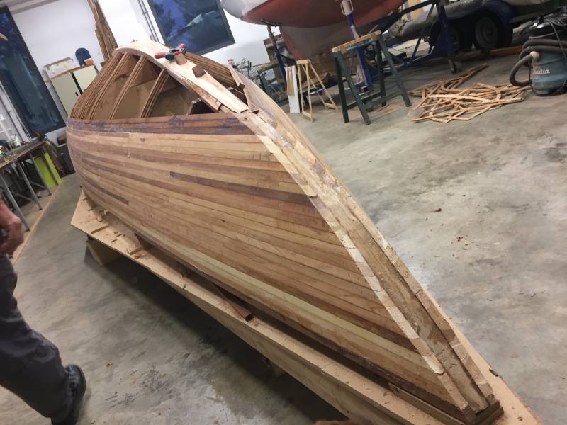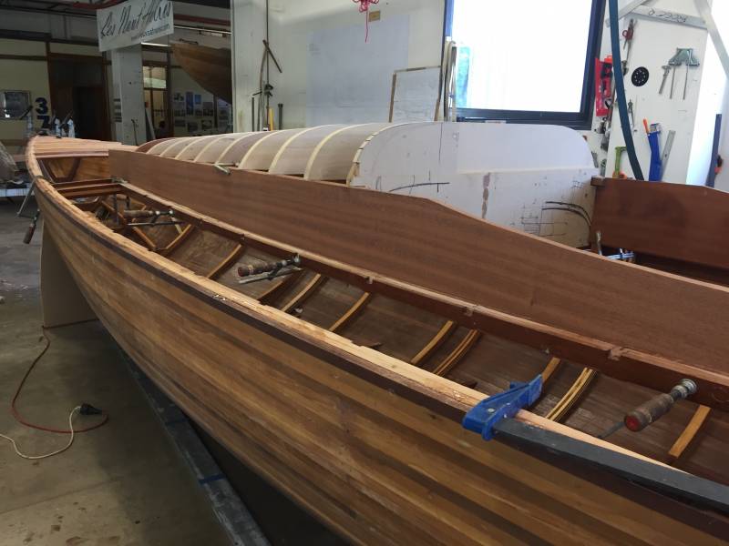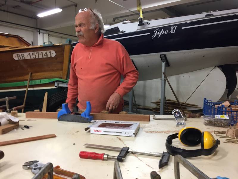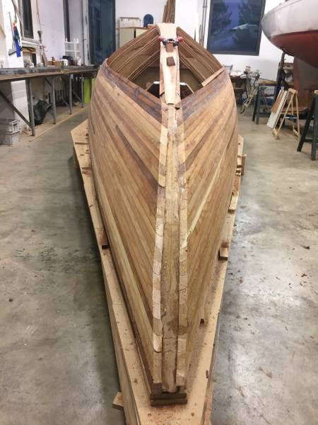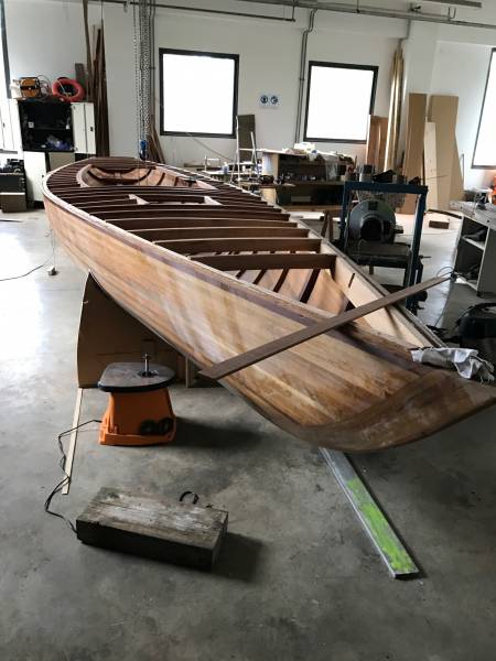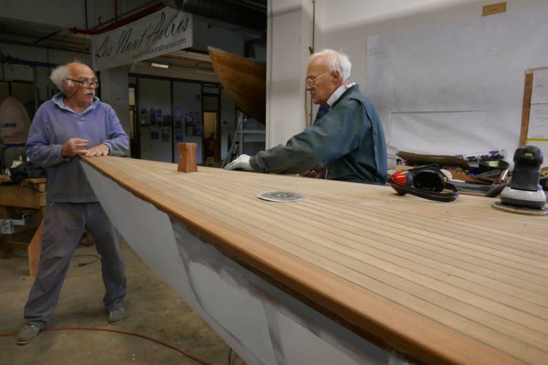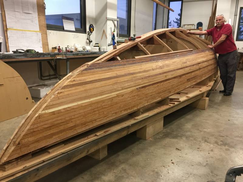 Après tant d’années à retaper des requins et toutes autres embarcations, Roger Quenet s’est lancé dans le grand projet de construction d’un nouveau requin en strip planking. Si chaque pièce de bois sera découpée, taillée, poncée pour donner forme à cette nouvelle unité; la quille, le safran, sa mèche et son tube de chaumière proviennent quant à eux d’un requin en décrépitude qui porte encore le nom d’Hirondelle.