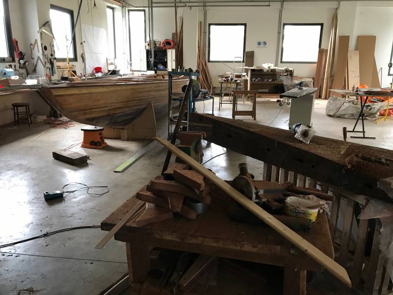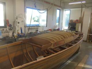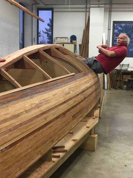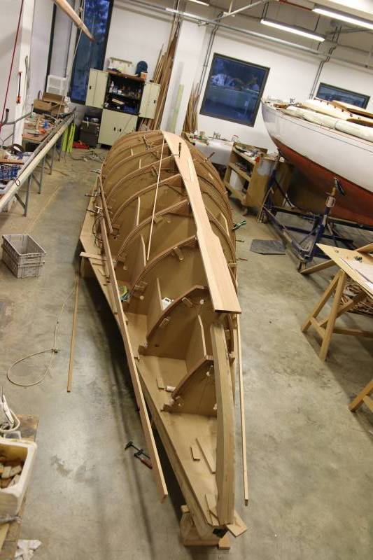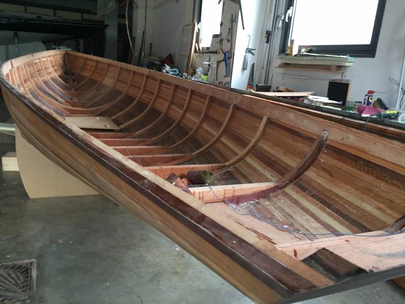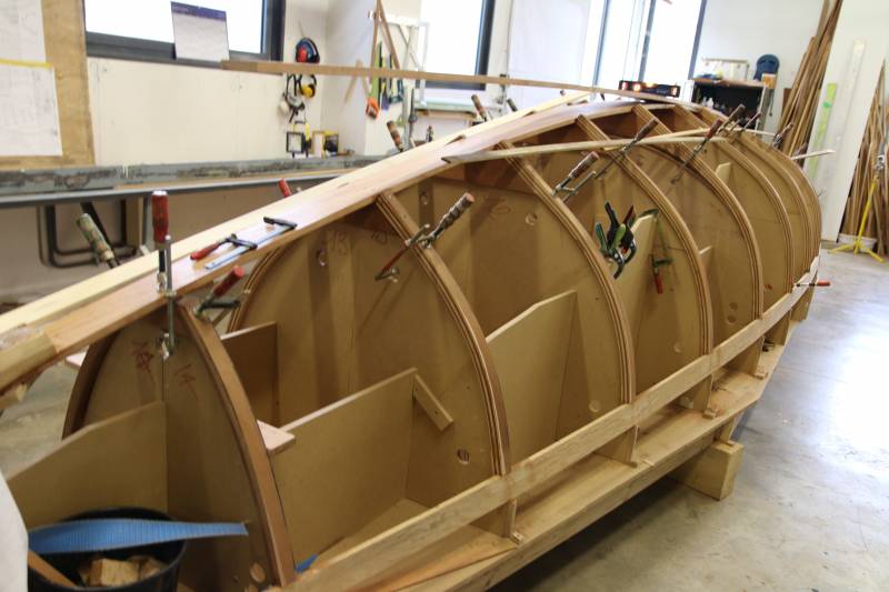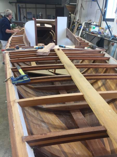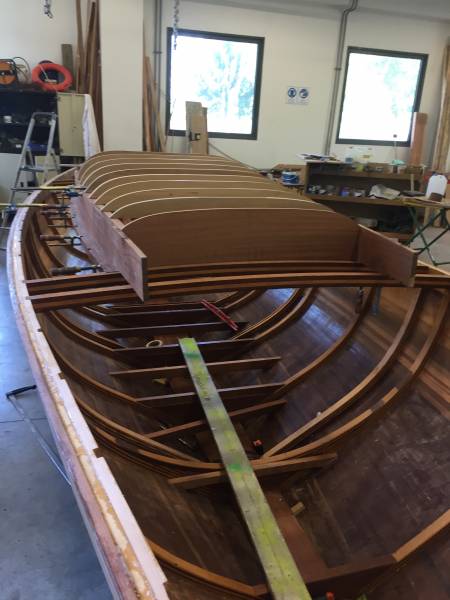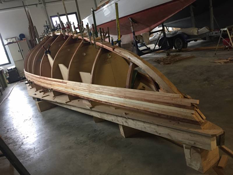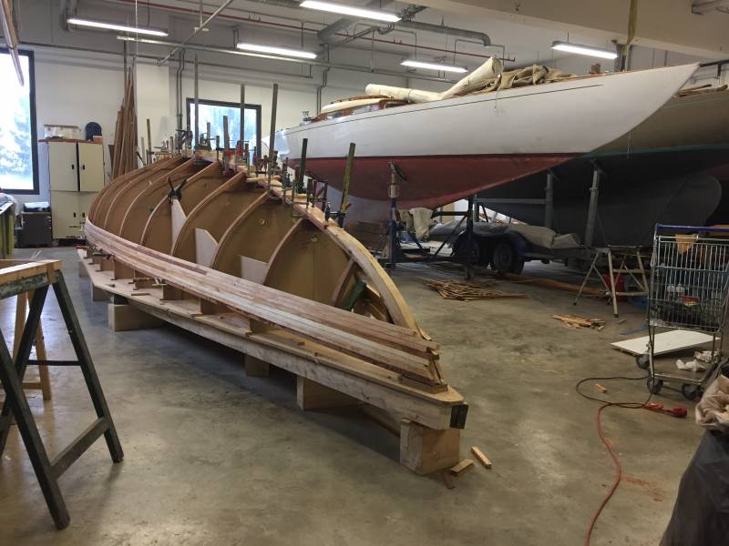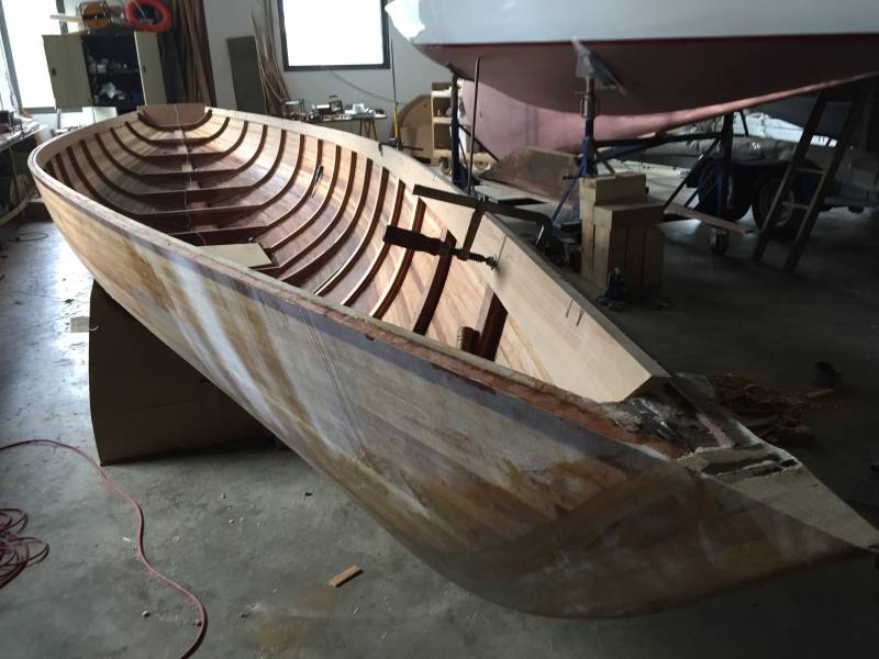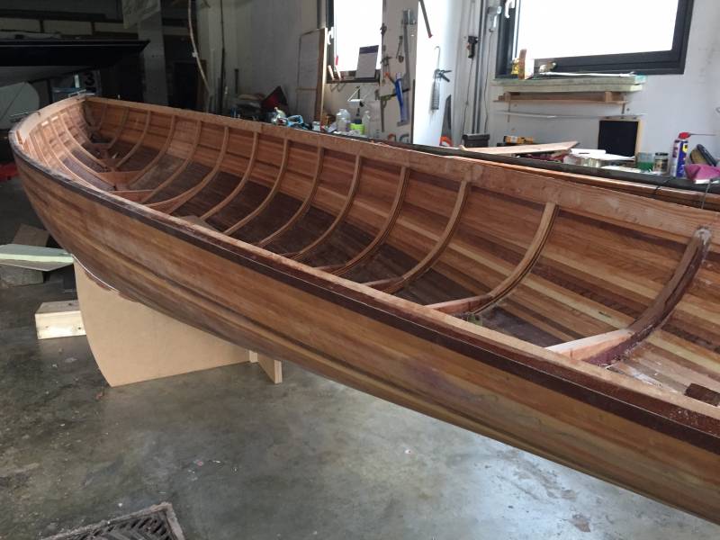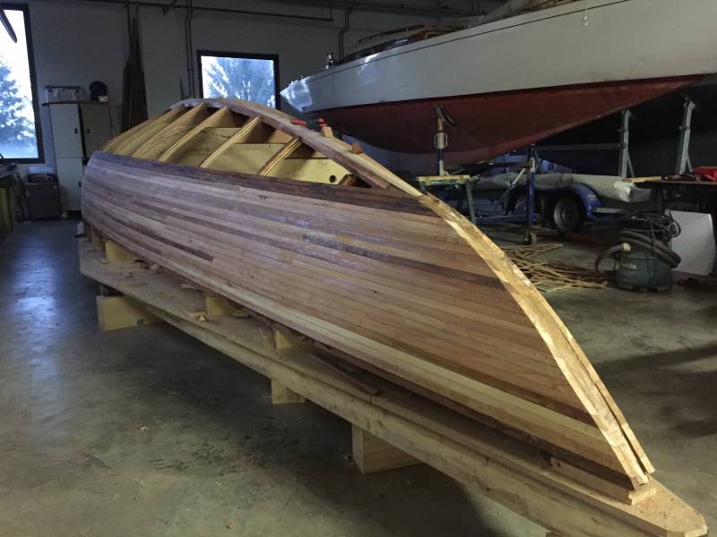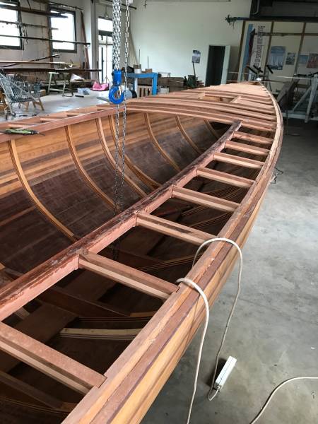 Après tant d’années à retaper des requins et toutes autres embarcations, Roger Quenet s’est lancé dans le grand projet de construction d’un nouveau requin en strip planking. Si chaque pièce de bois sera découpée, taillée, poncée pour donner forme à cette nouvelle unité; la quille, le safran, sa mèche et son tube de chaumière proviennent quant à eux d’un requin en décrépitude qui porte encore le nom d’Hirondelle.