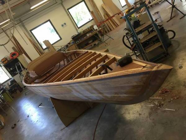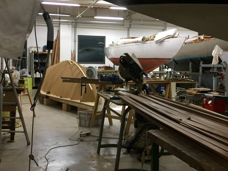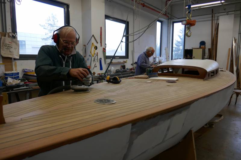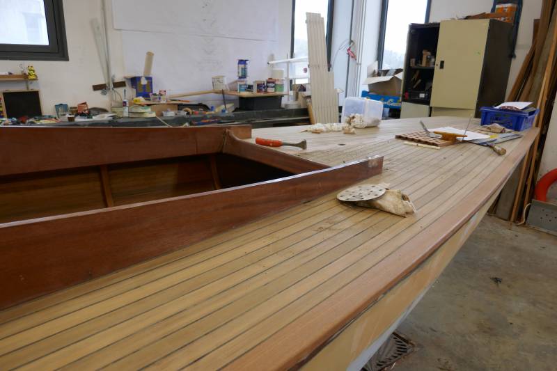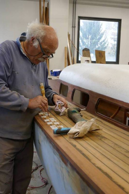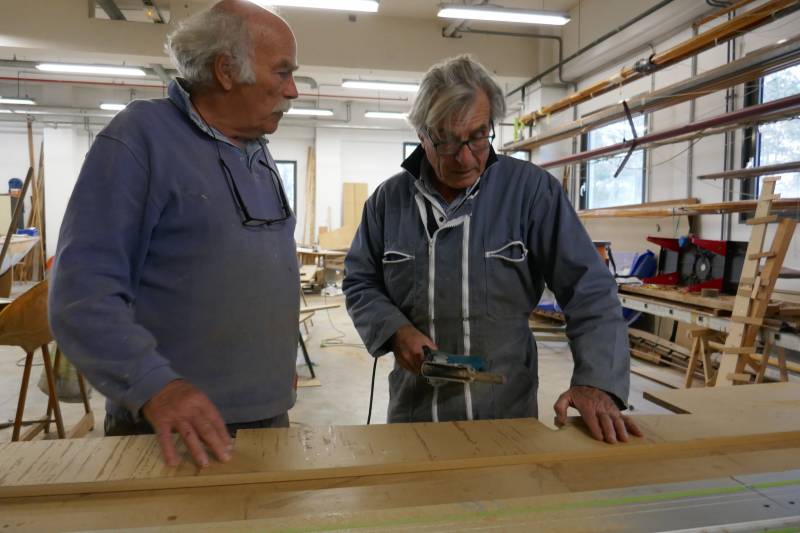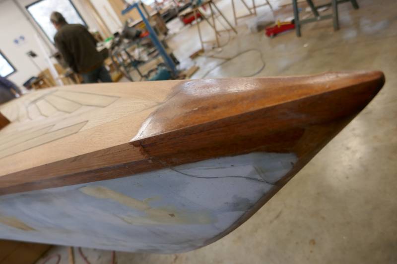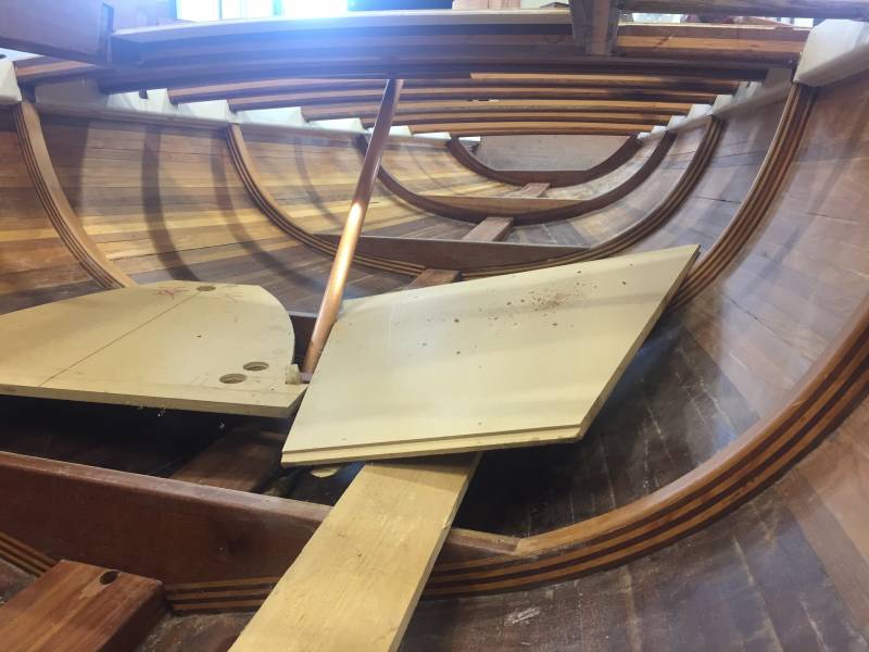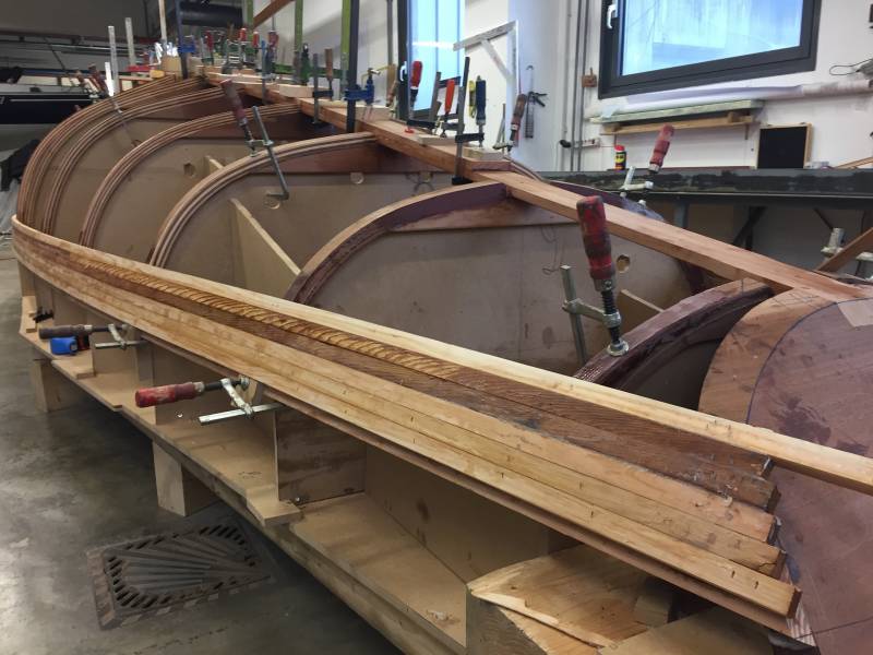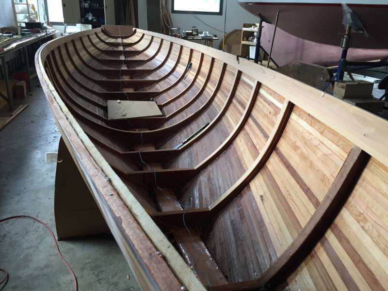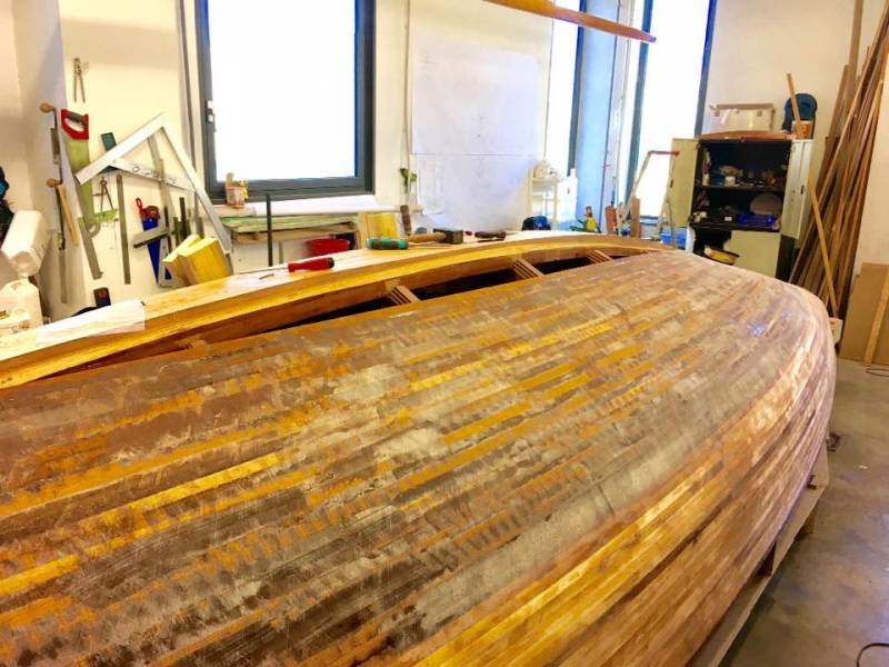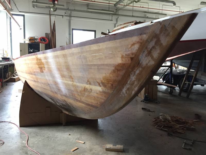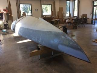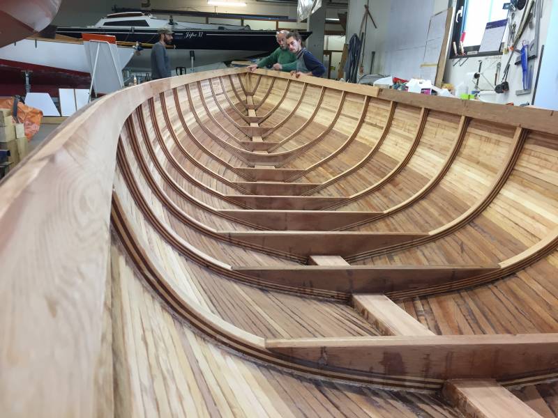 Après tant d’années à retaper des requins et toutes autres embarcations, Roger Quenet s’est lancé dans le grand projet de construction d’un nouveau requin en strip planking. Si chaque pièce de bois sera découpée, taillée, poncée pour donner forme à cette nouvelle unité; la quille, le safran, sa mèche et son tube de chaumière proviennent quant à eux d’un requin en décrépitude qui porte encore le nom d’Hirondelle.