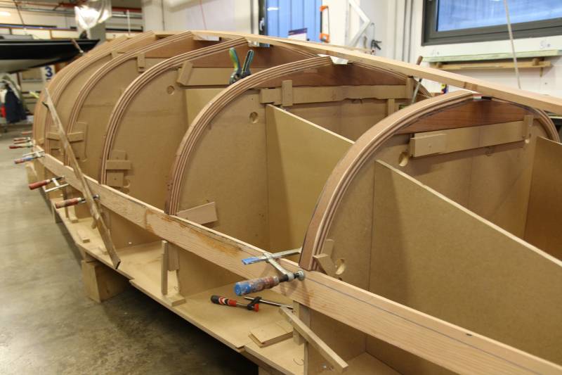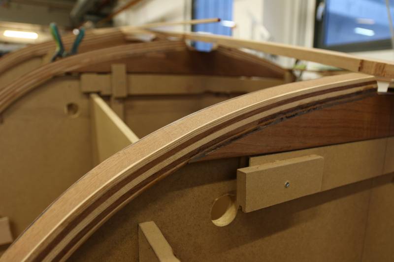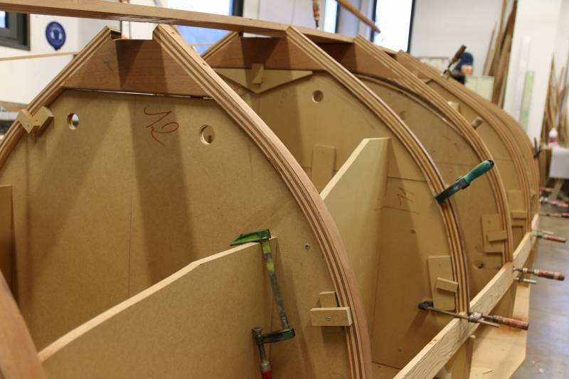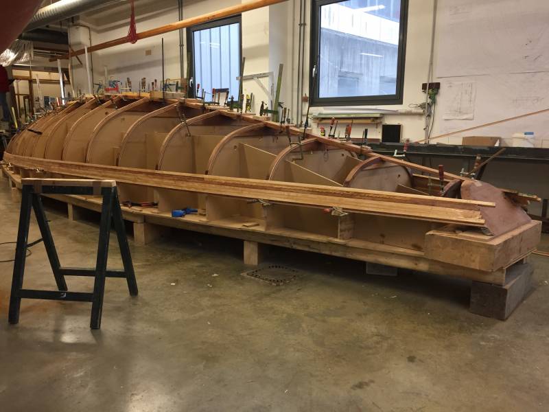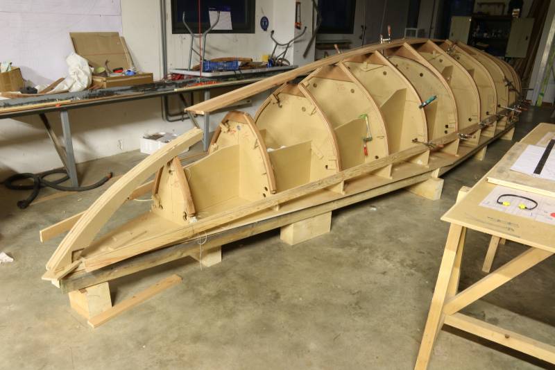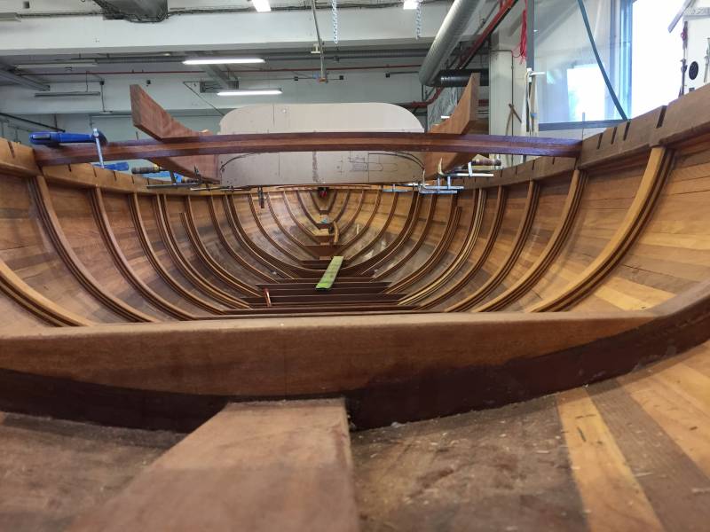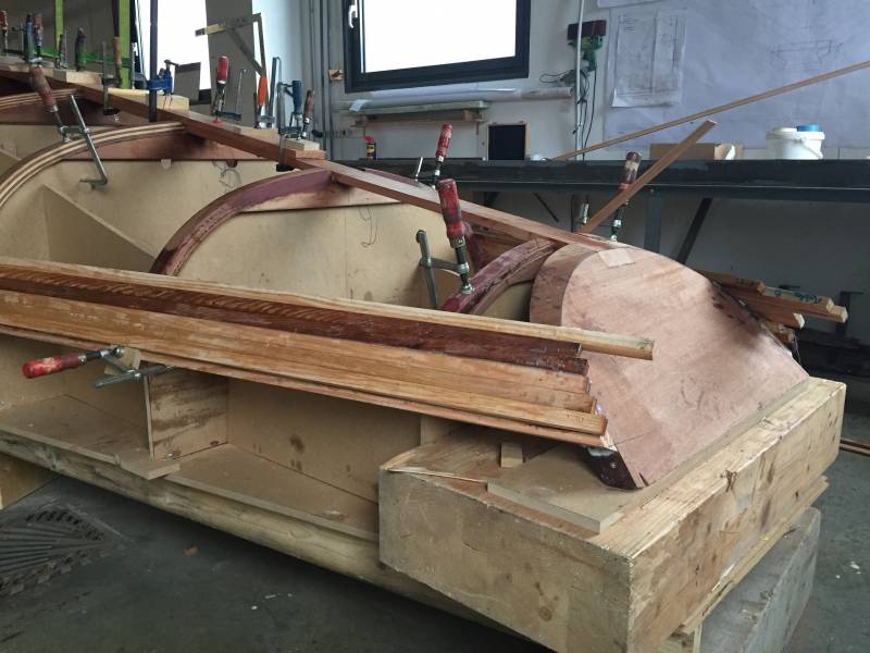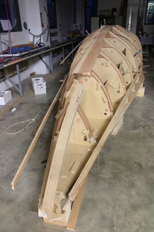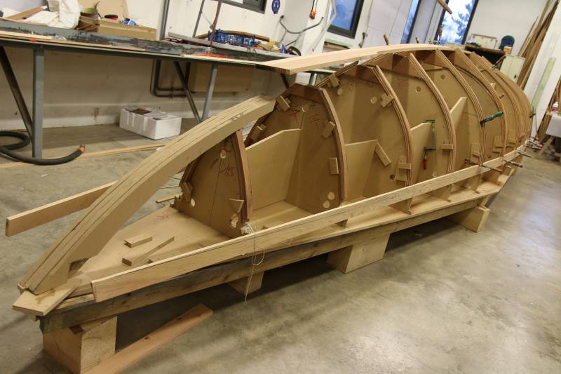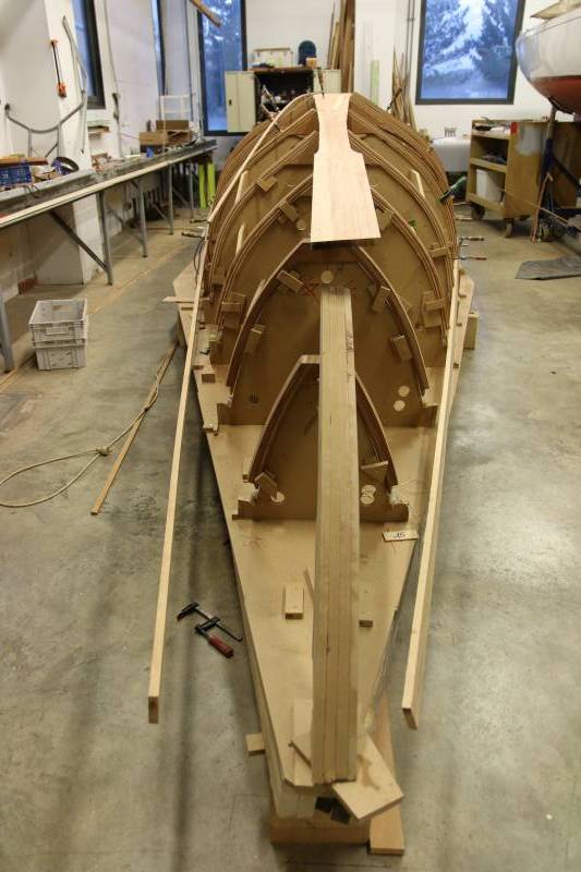 Membrures, bauquières, étrave, fausse-quille, étambot et tableau arrière sont collés! A quelques nombreuses heures de travail près le plus difficile est fait…