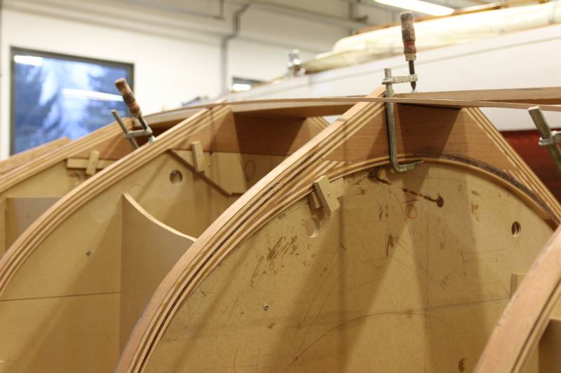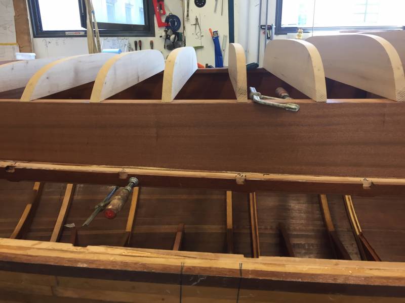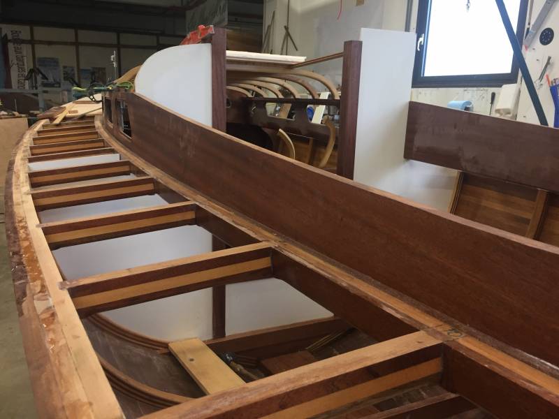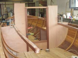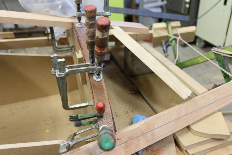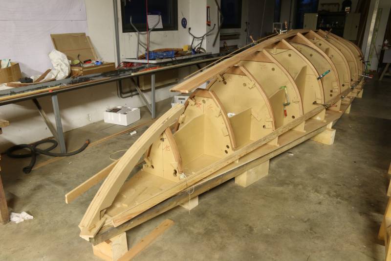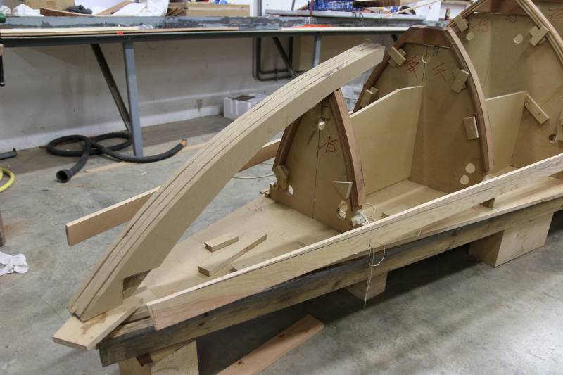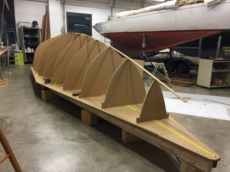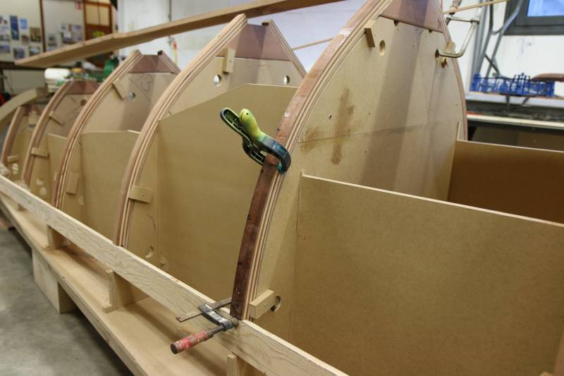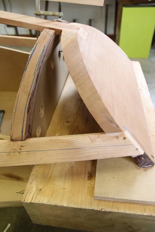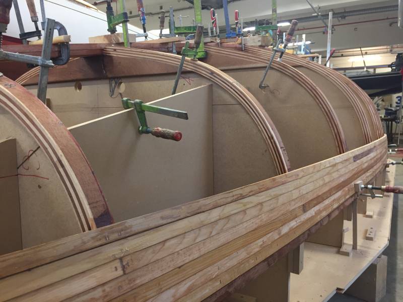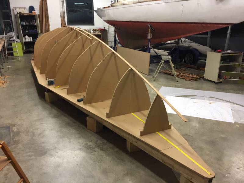 Membrures, bauquières, étrave, fausse-quille, étambot et tableau arrière sont collés! A quelques nombreuses heures de travail près le plus difficile est fait…